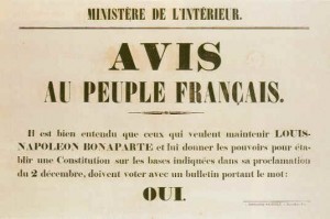 Le décret du 2 décembre 1851 constitutif du coup d’État de Louis-Napoléon Bonaparte, violant la Constitution en prononçant la dissolution de l’Assemblée nationale, prévoit dans son article 3 la convocation du 14 au 21 décembre d’un plébiscite destiné à approuver ce coup de force.